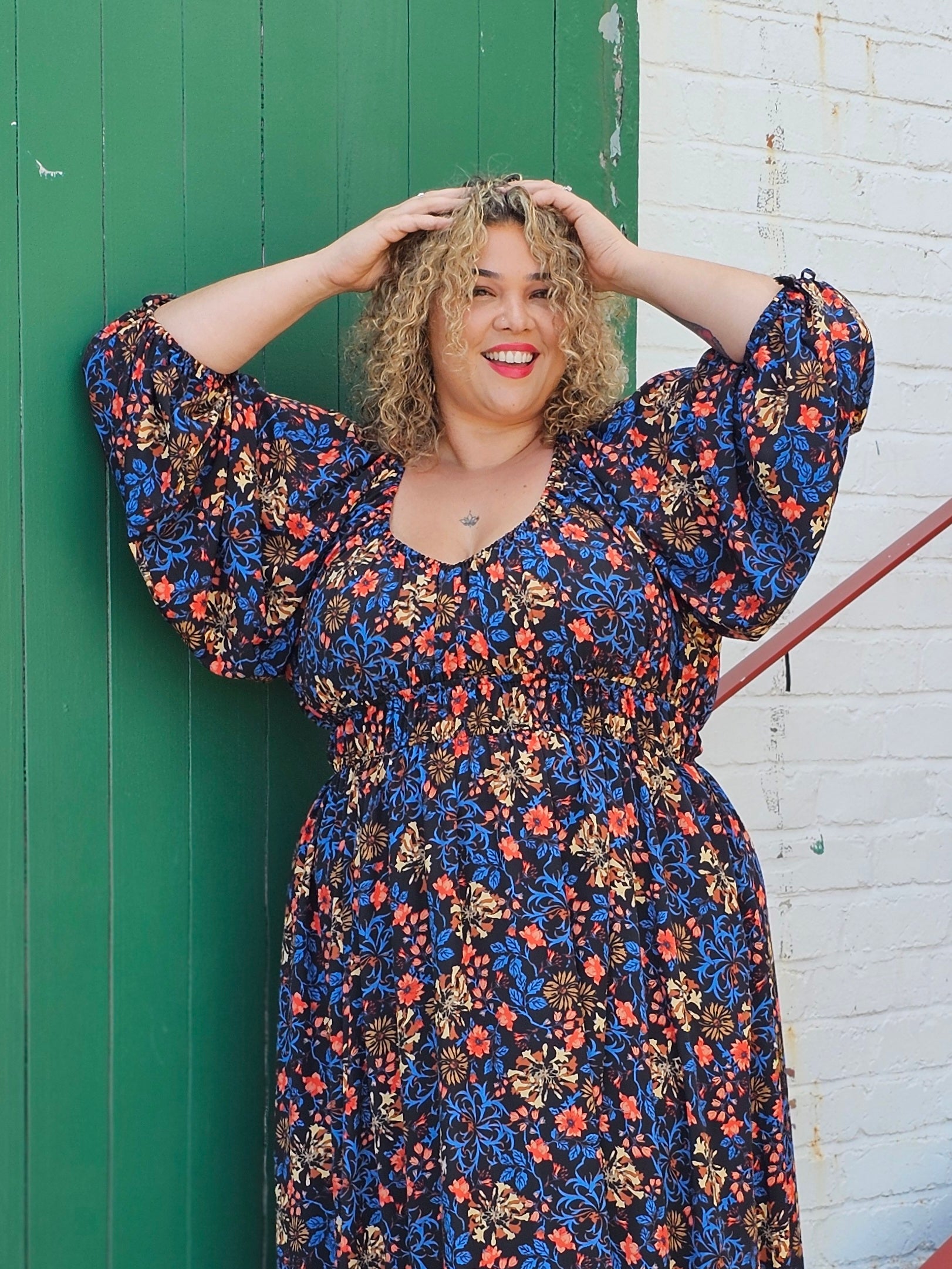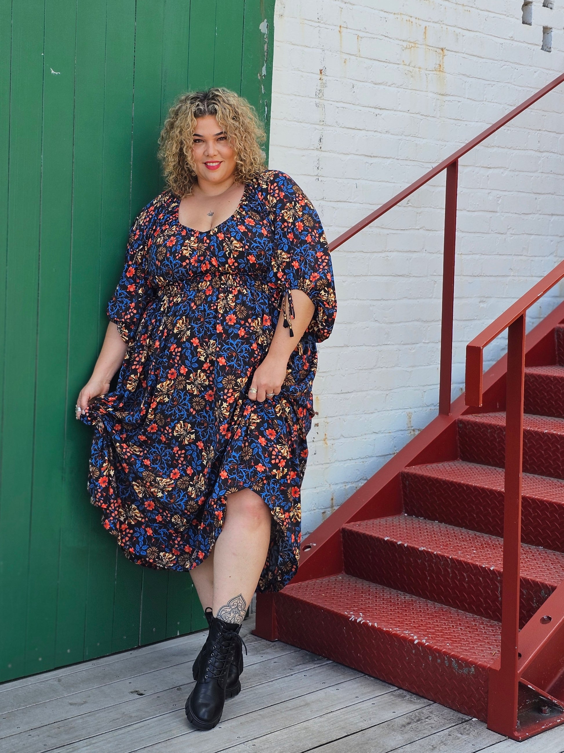 Don't walk...RUN! She's pretty, she's swishy. she's flattering...meet Aurora. With her big sleeves, full skirt and plunging neckline, she will highlight your best features while skimming over your bums and tums effortlessly. Wear it with cowboy boots, heels or sandals, she's perfect for all occasions.