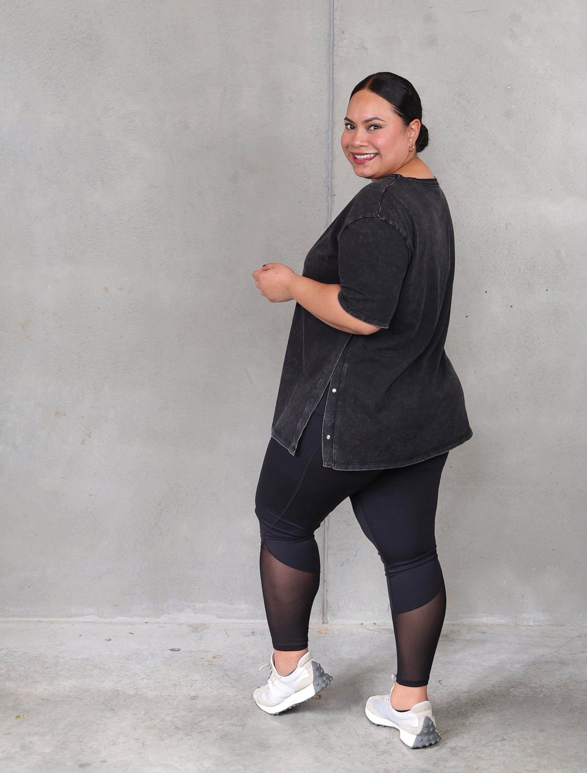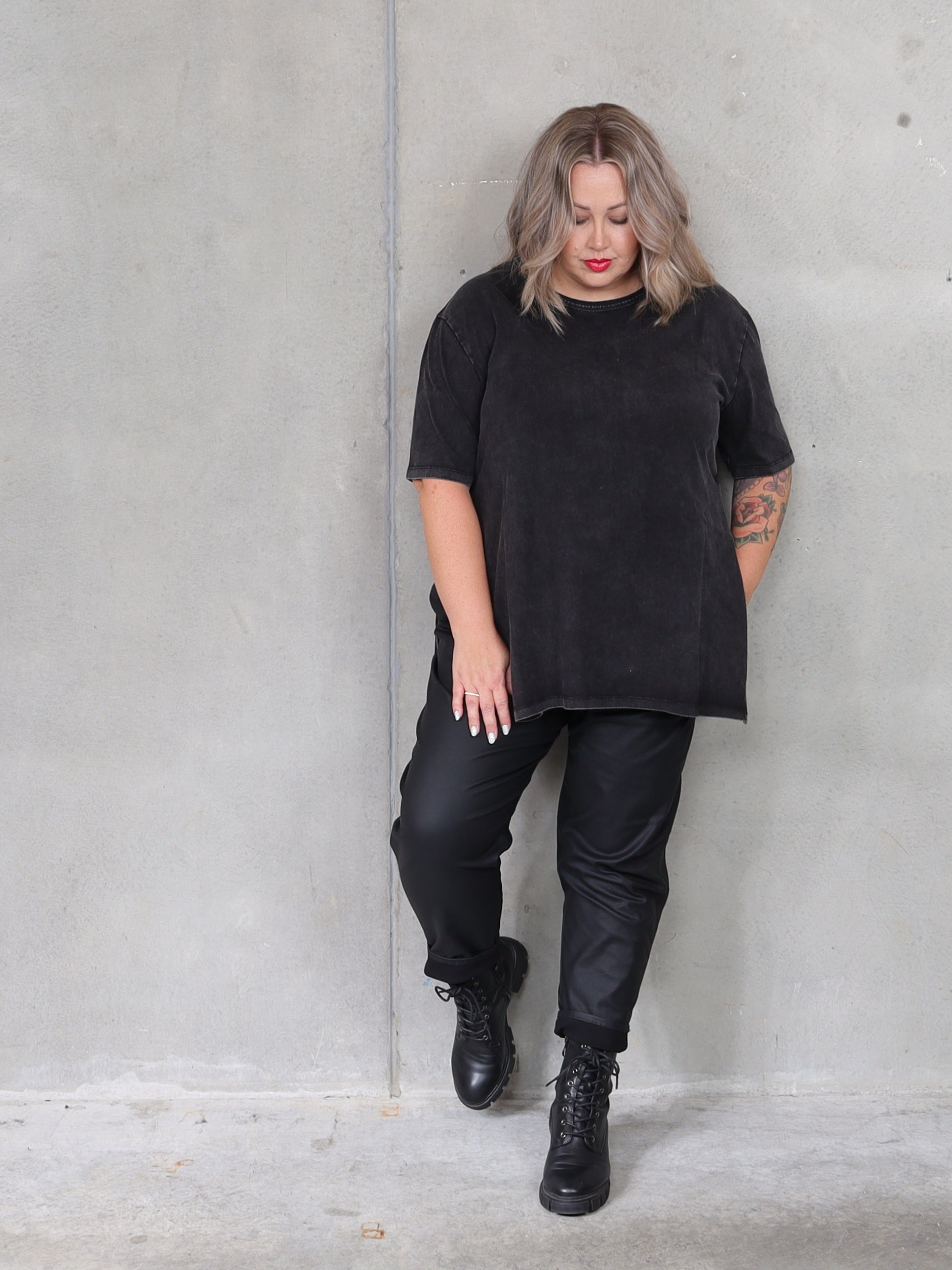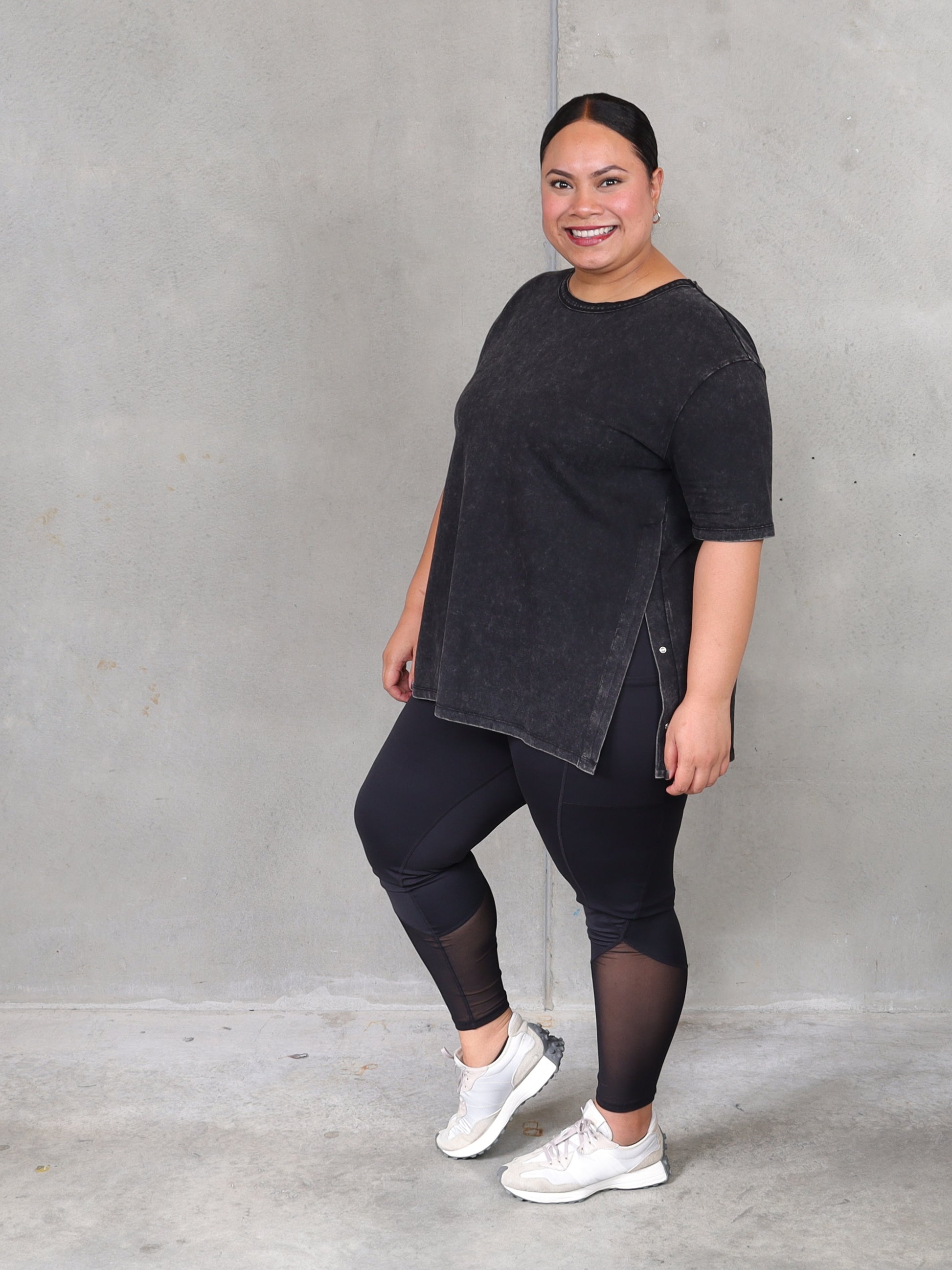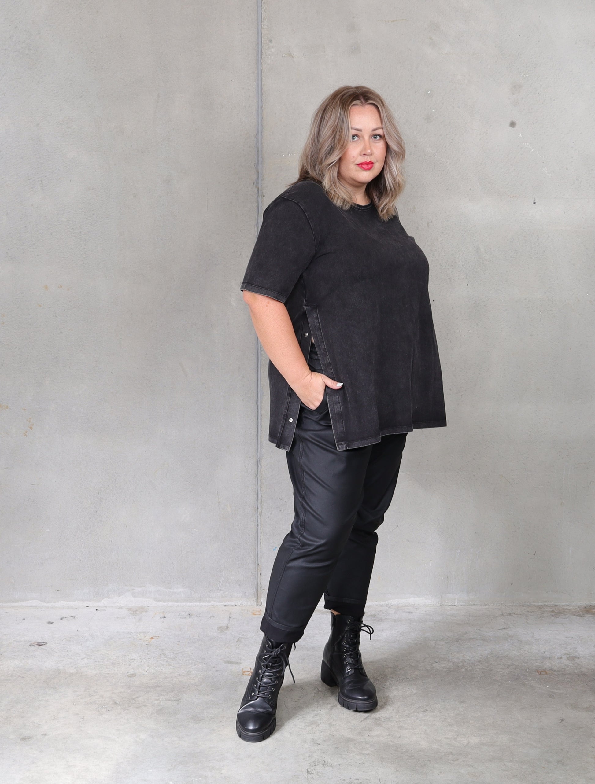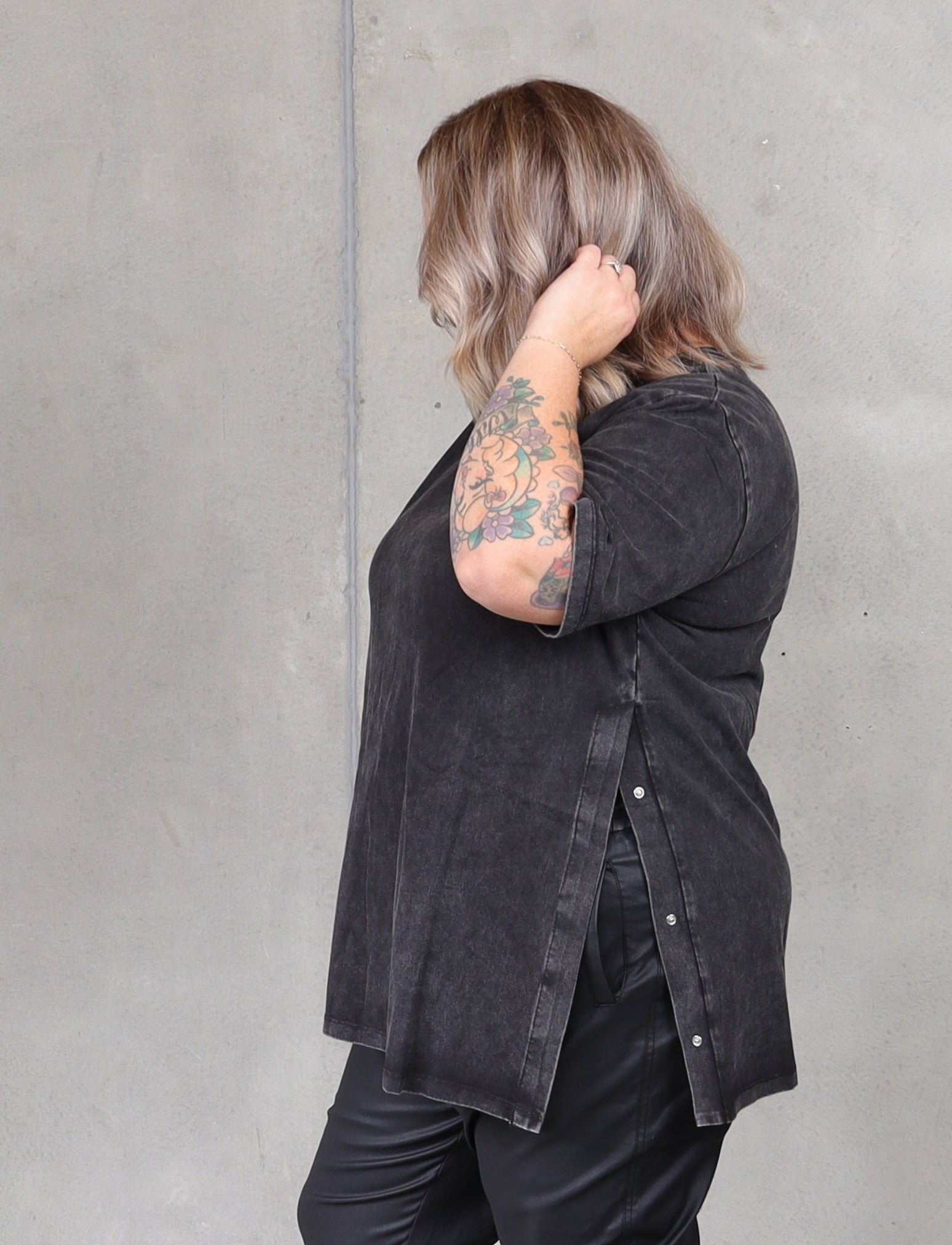 The perfect tee doesn't exi-...Never mind, found it. The black enzyme washed fabric is so soft and the studs on the side makes it very versatile. Wear it open over dresses or pants, it will elongate your body or done up over tights, it will add a bit more coverage. We love it. And we know you will too.