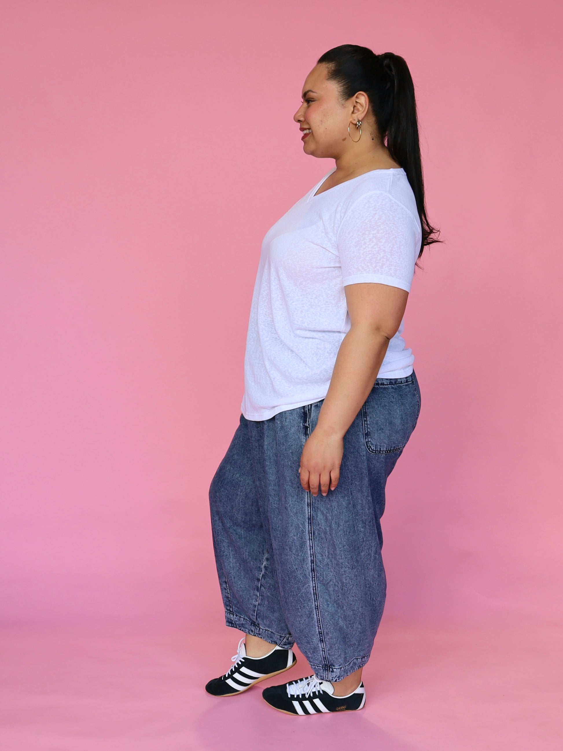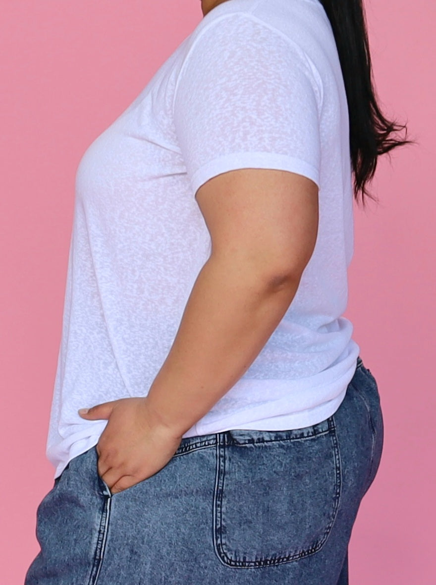 A wardrobe essential, this simple tee features a flattering V-neckline and elbow-length sleeves for just the right amount of coverage. Crafted from a lightweight, breathable fabric, it feels effortlessly soft against the skin—perfect for warm days or easy layering year-round. Minimal and versatile, it’s the kind of go-to basic you’ll reach for again and again.