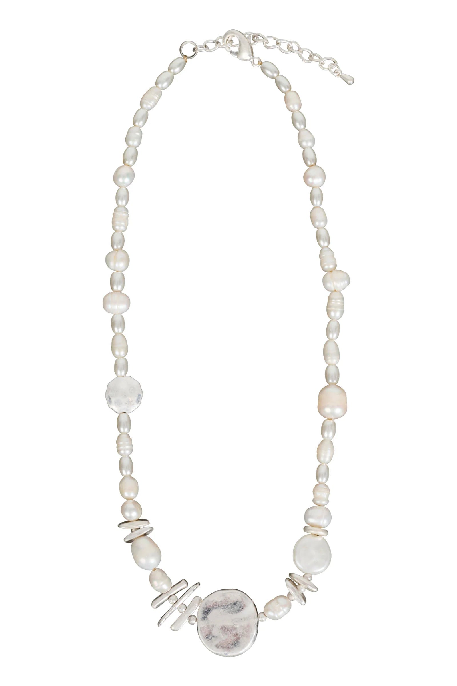 This silver-tone necklace brings together freshwater pearls and organic-style beads, anchored by a pressed silver coin pendant. Quietly confident, it's a lovely choice for beachside dinners or slow mornings in the sun.