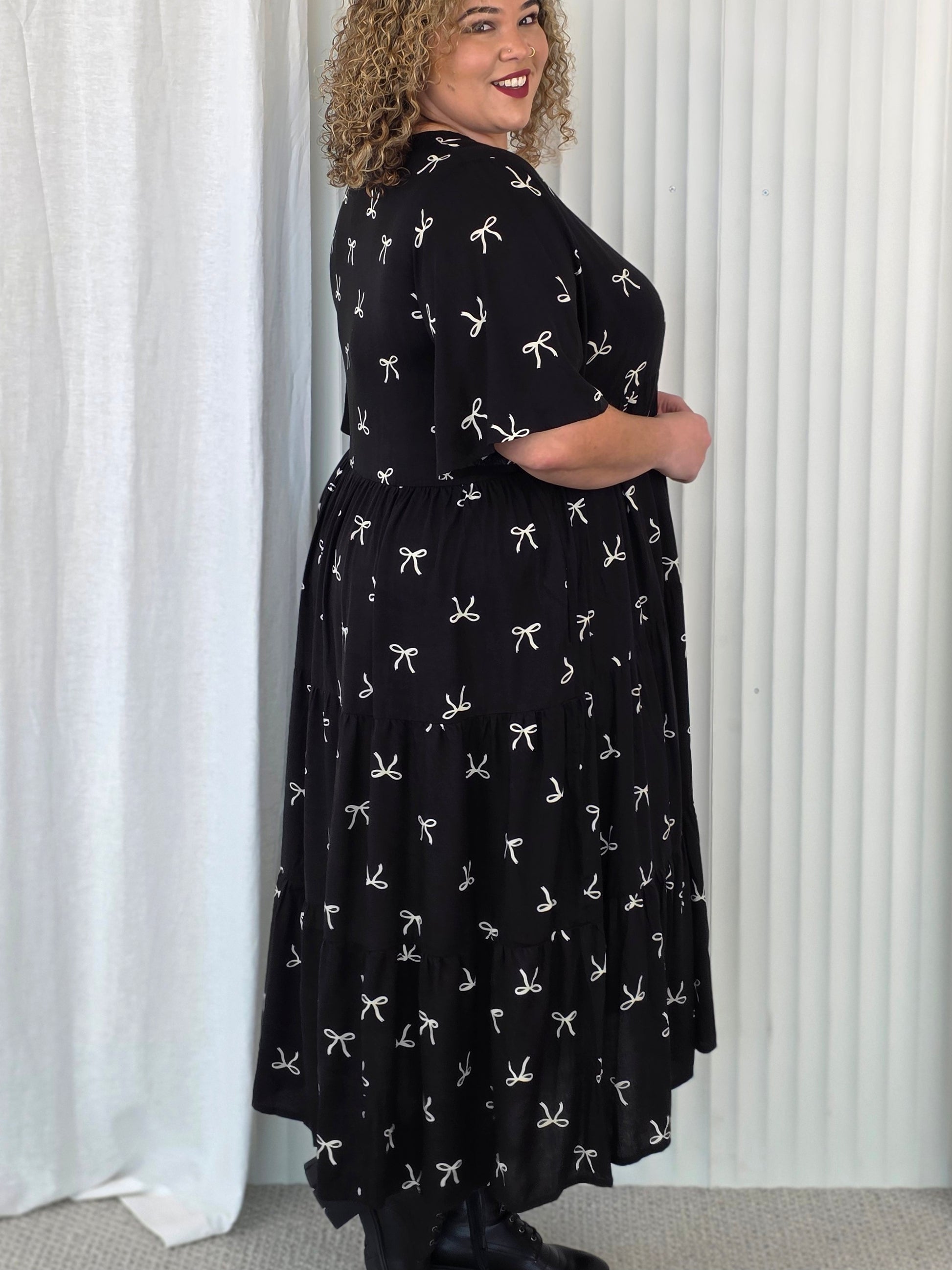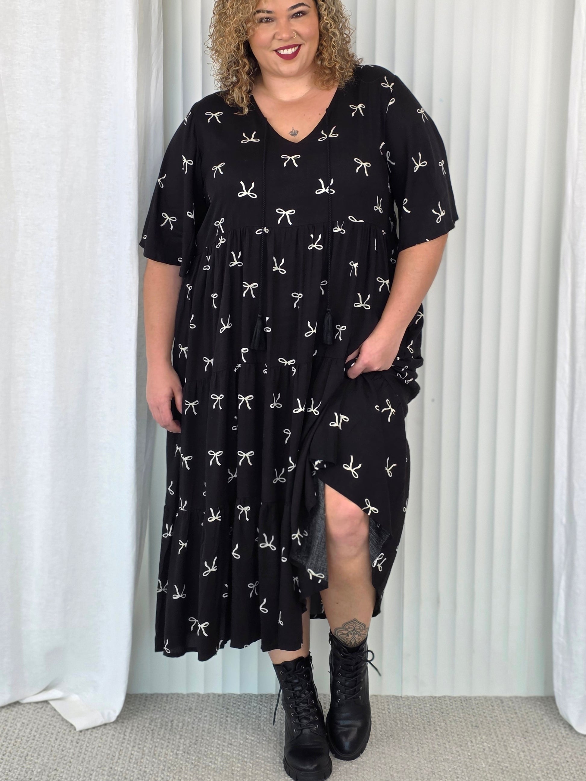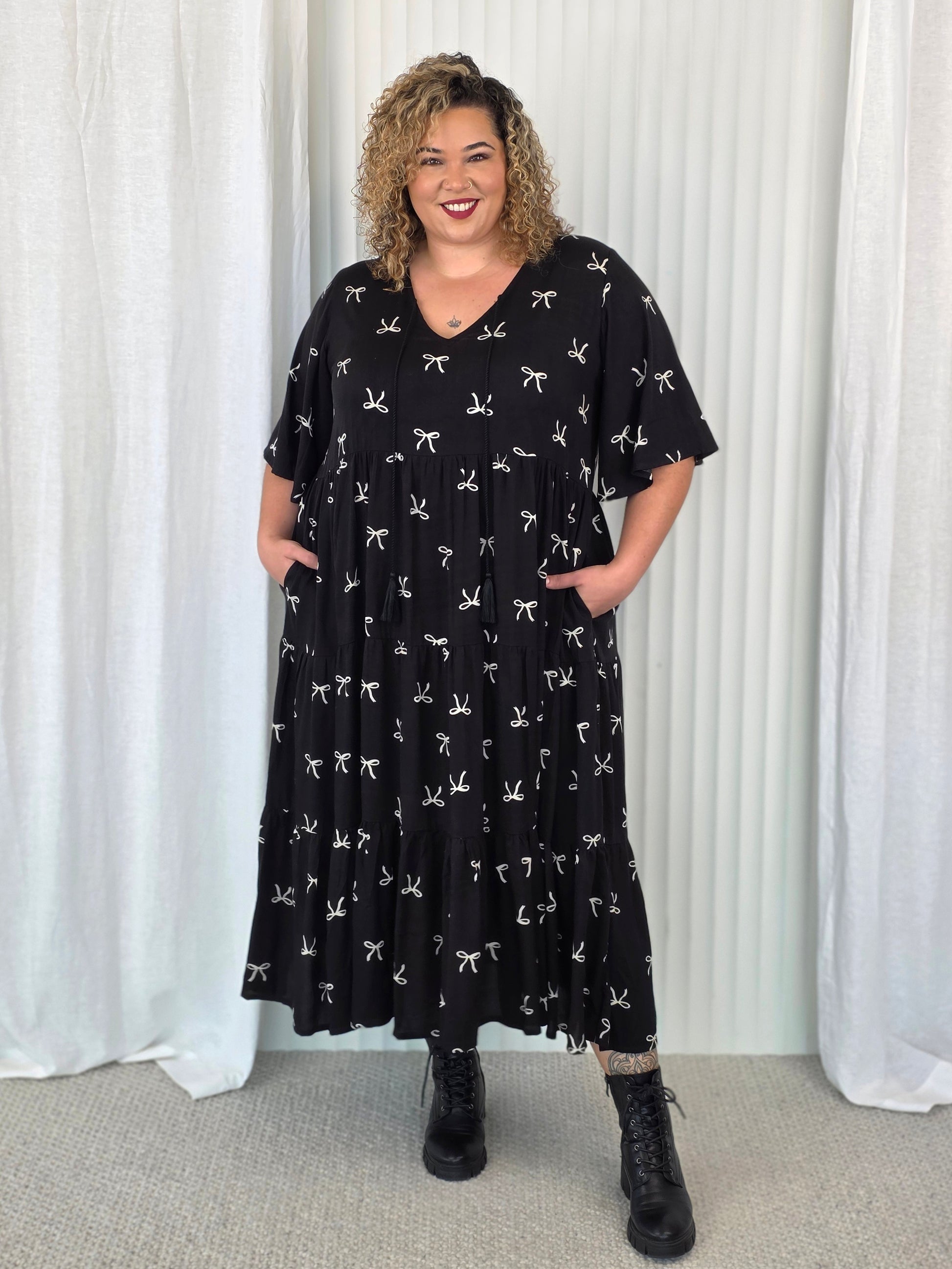Easy, breezy, and endlessly versatile—this tiered flowy dress is your year-round go-to. Made from lightweight, breathable rayon that moves with you, it features a flattering V-neckline, delicate tassel ties, and hidden side pockets (yes, pockets!). The tiered silhouette gives it an effortless drape, perfect for warm beach days or layered under a jacket when the temperature drops.