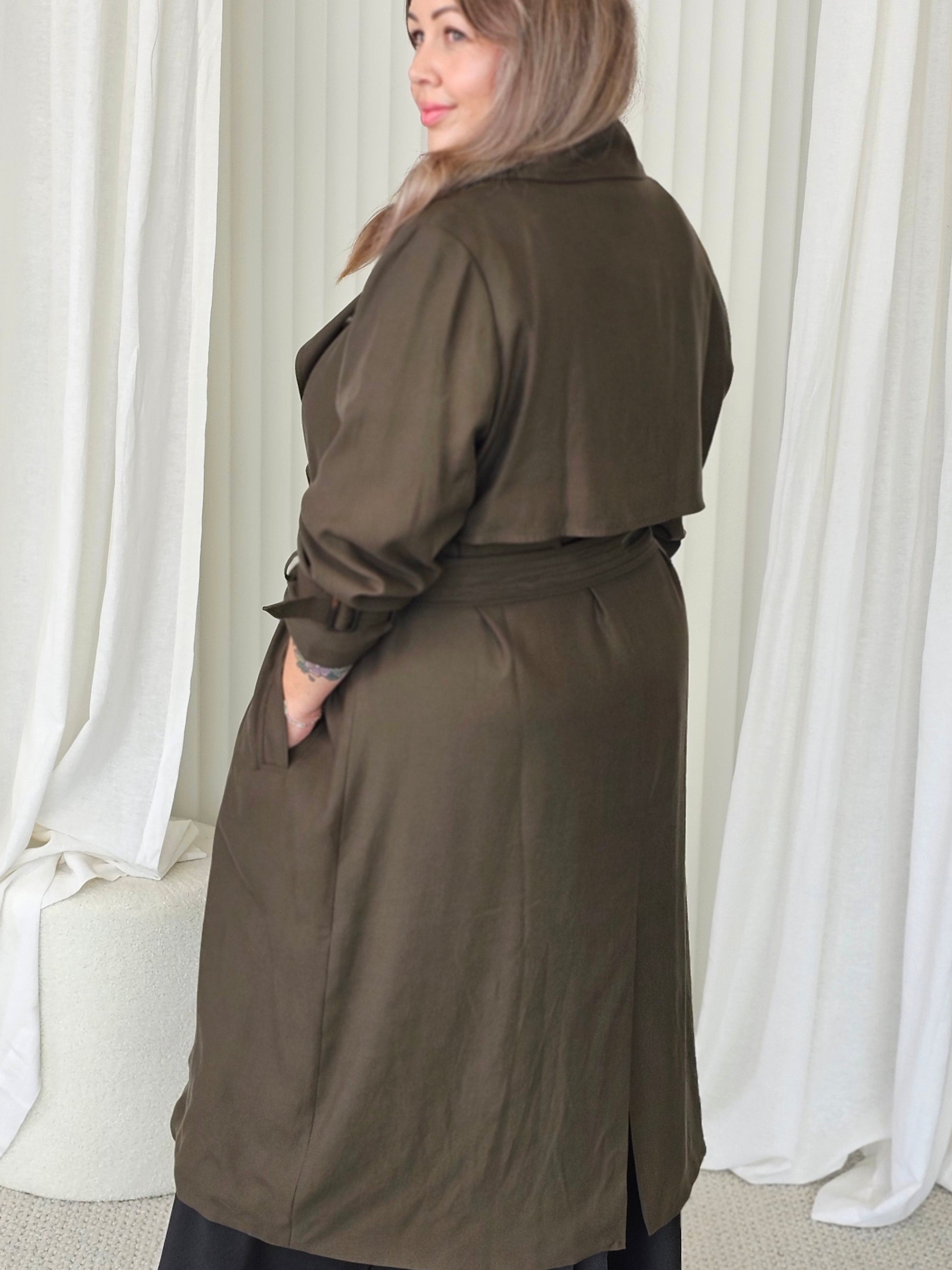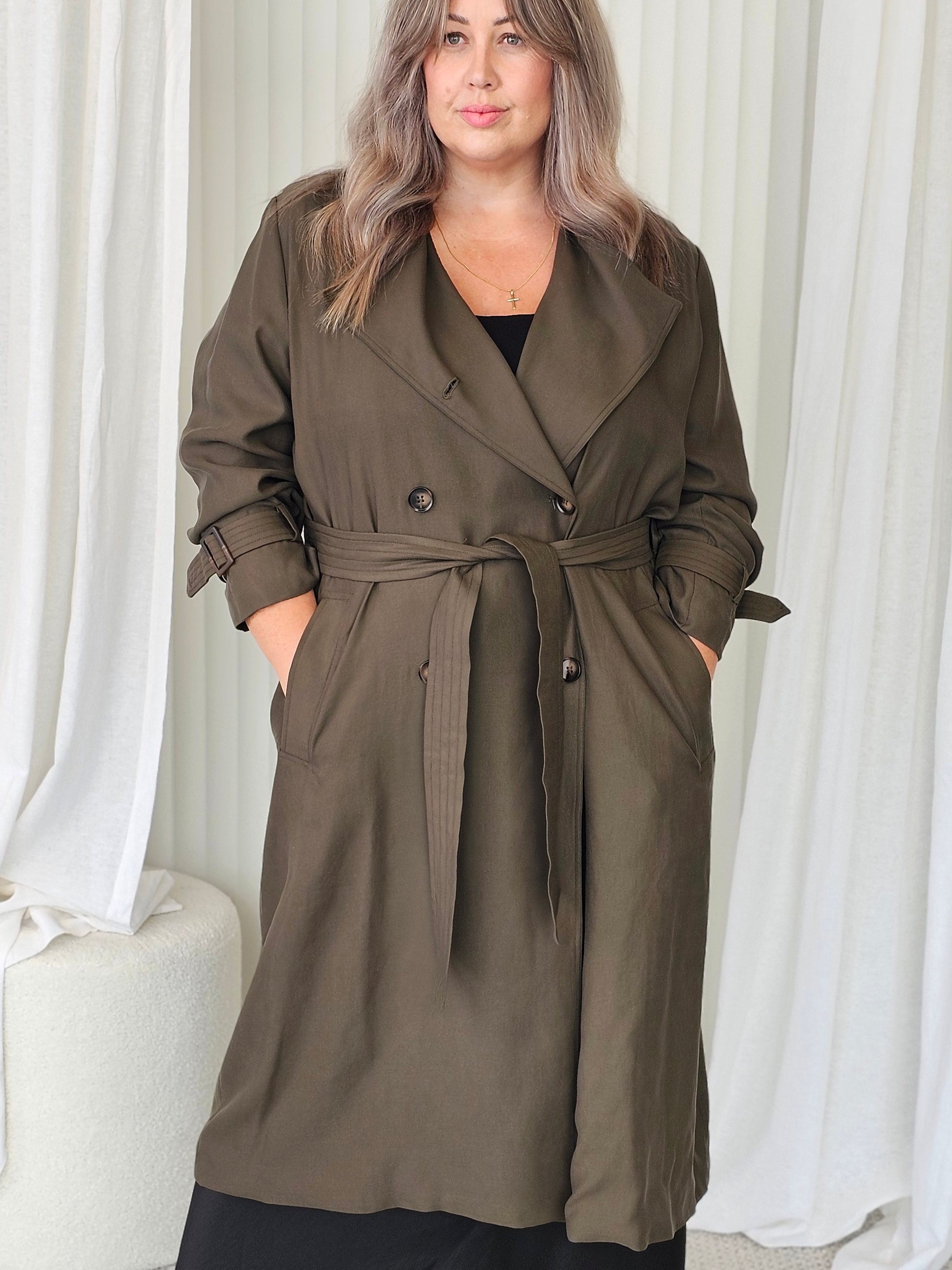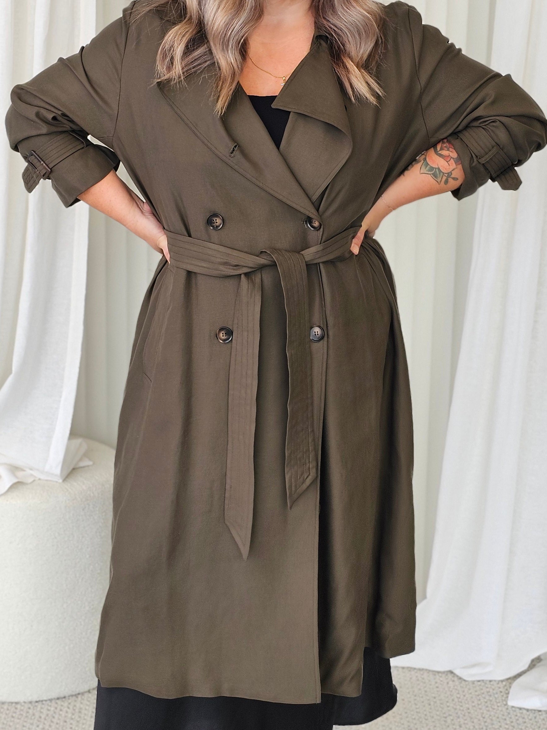 Our new London Calling trench is THE best trench out there. Soft and drapey, it will elevate and turn any outfit into an effortless classic look. The loose fit is great for layering and the belt and adjustable arm bands will allow you to add definition where you want to. Of course, it has pockets as well...Just the perfect trench all around.