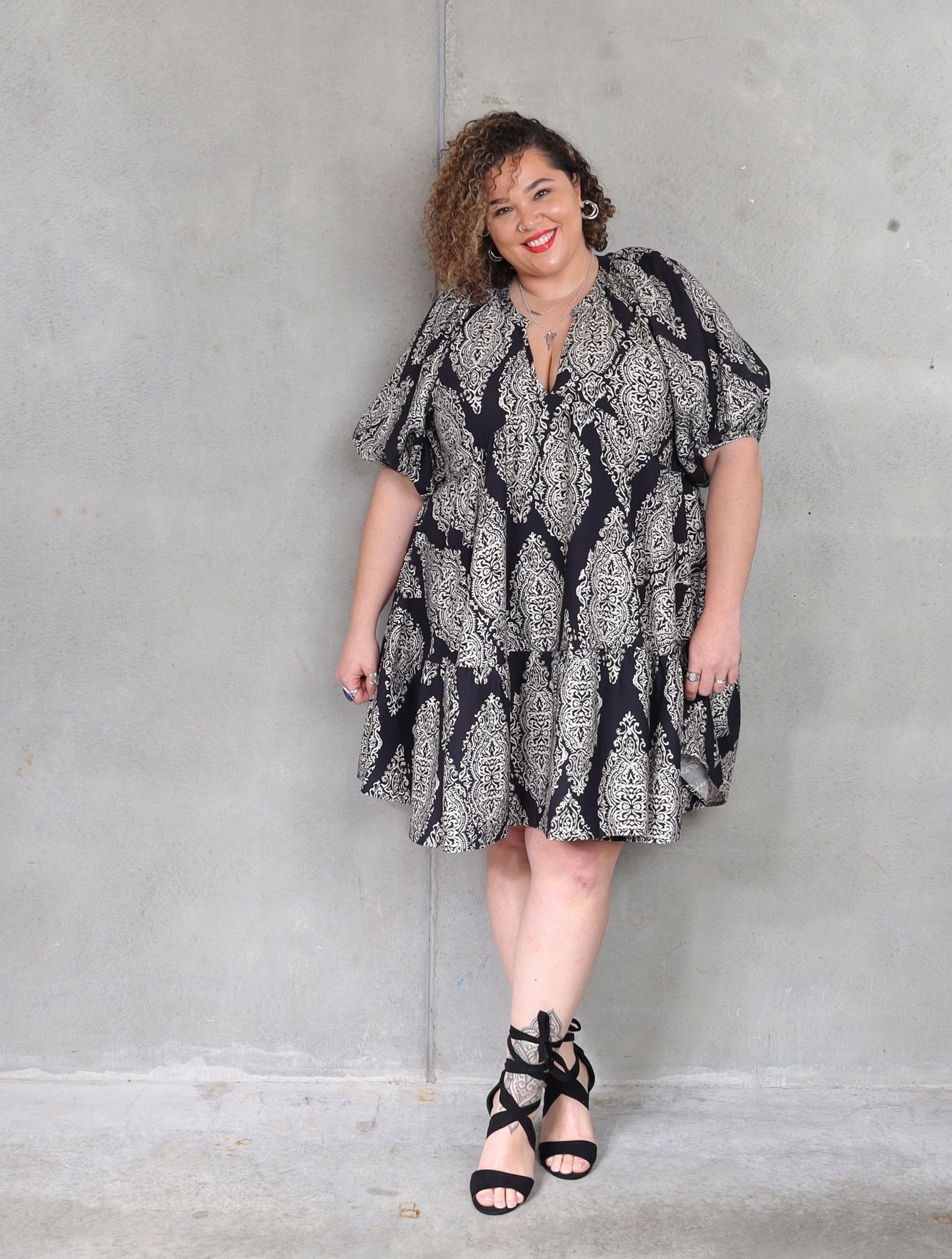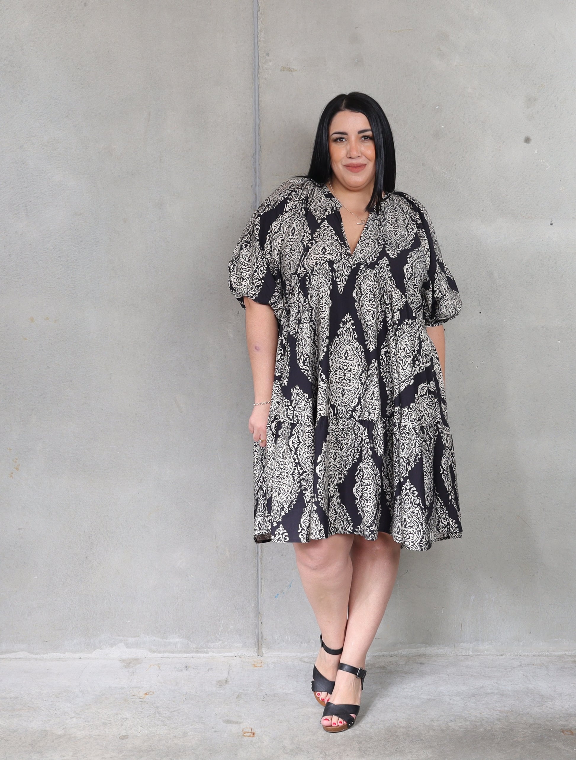 Our popular Mamma Mia Dress now comes in this gorgeous Baroque print. The cotton mix fabric falls beautifully and with its flattering V-Neck, A-line tiered body and great billow sleeves, this dress will take you from day to night effortlessly.