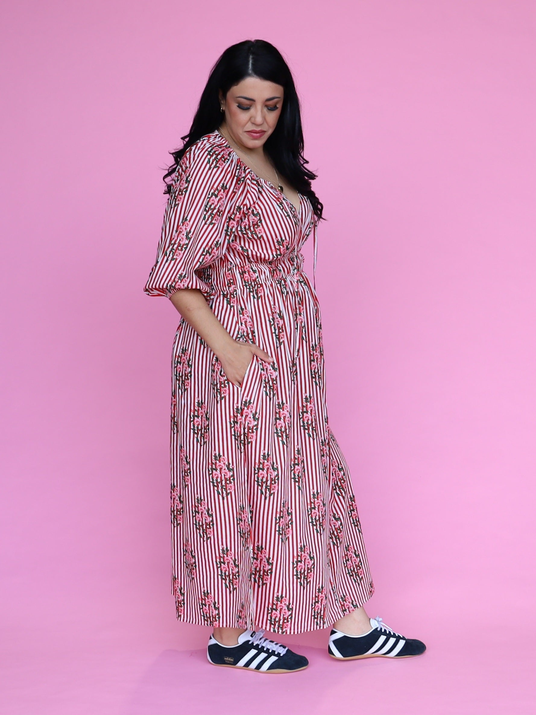 Feminine, flattering, and effortlessly pretty—this dress is made to make you feel your best. Featuring a deep V-neckline and a beautifully shirred, elasticated waist that cinches you in just right, it creates a silhouette that’s both comfortable and shapely. The soft 3/4-length sleeves with elastic cuffs add a gentle volume, completing the cutesy, romantic vibe. Whether dressed up with heels or worn casually with flats, this is an easy favorite for any occasion.