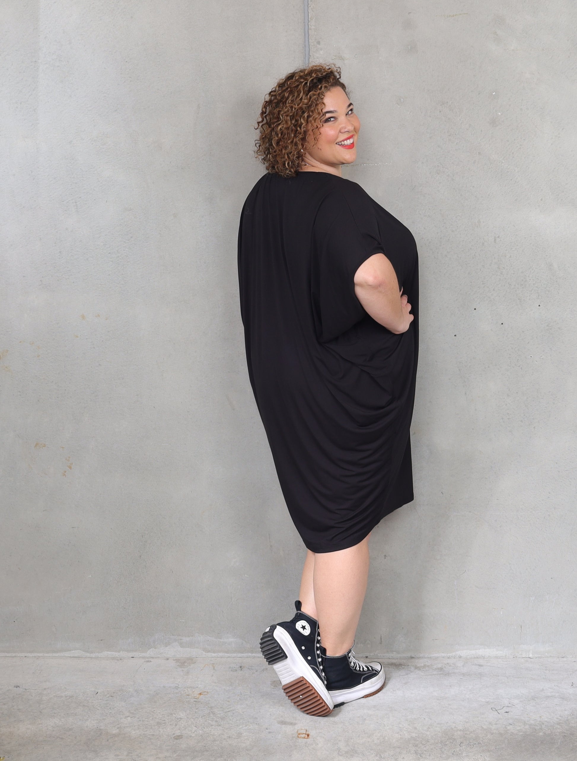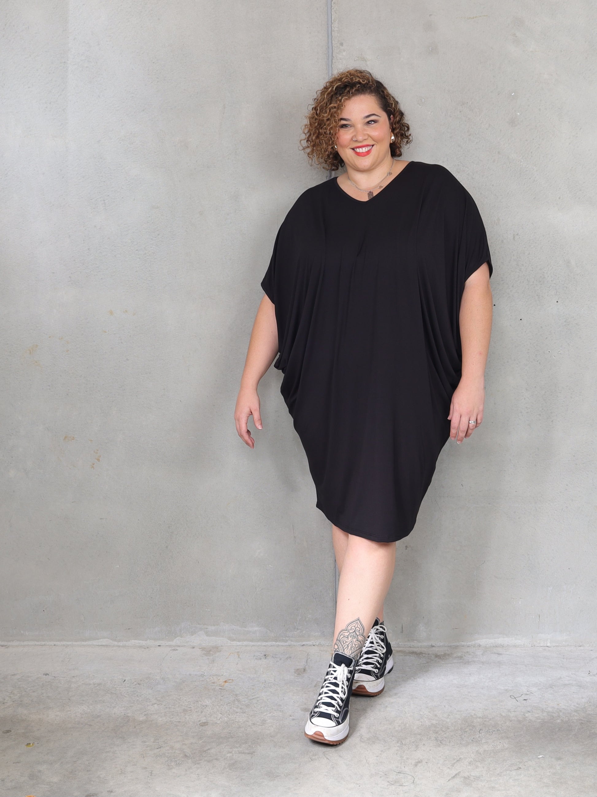 Feel comfortable and confident in the PQ Collection Miracle Dress in Black. The signature soft and breathable fabric is made from sustainable bamboo fibres and will have you feeling cool and carefree. Featuring batwing style draped sleeves, and a reversible V-Neckline for more coverage as a boat neck.
