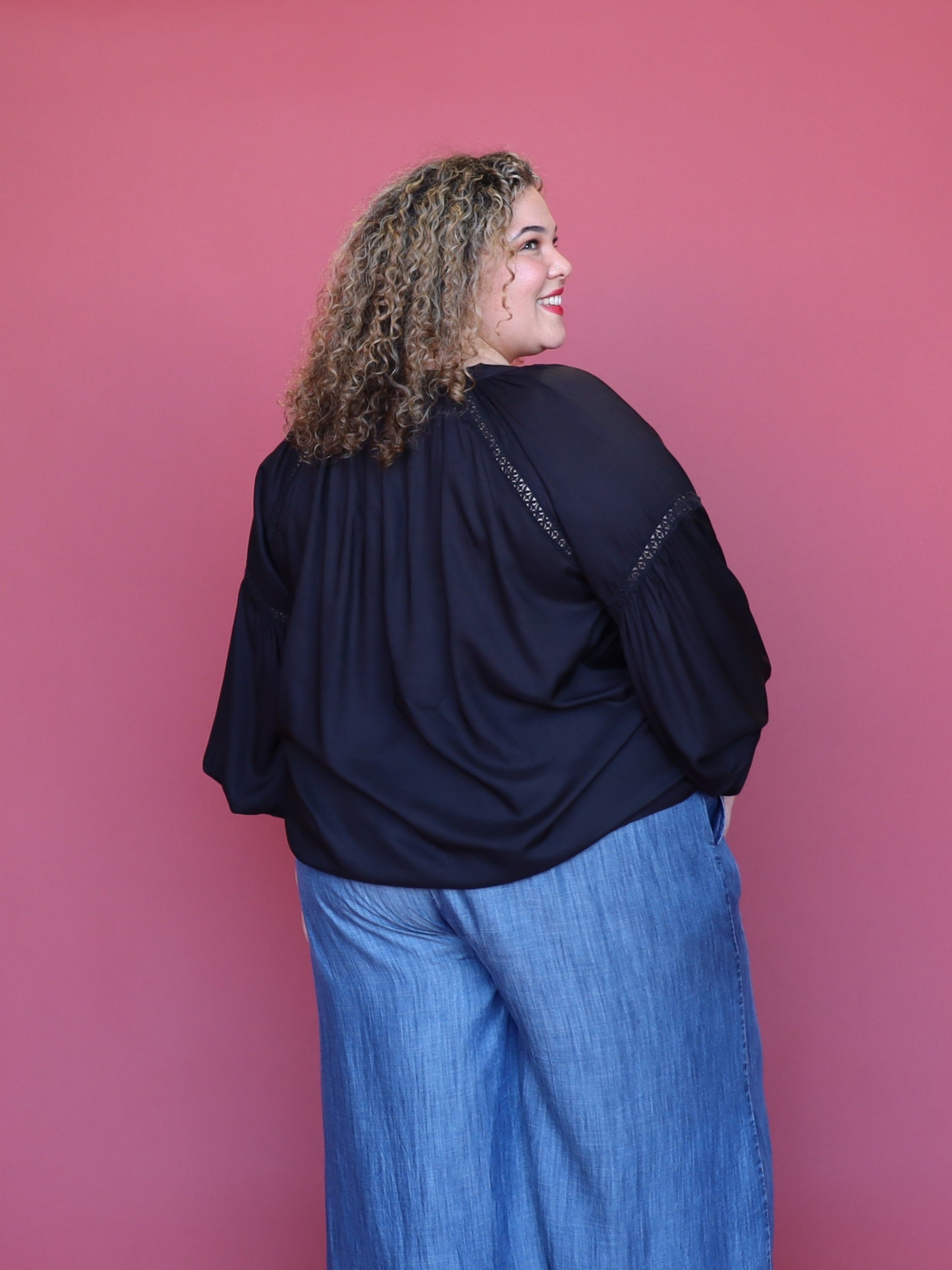 Our Sara Blouse is the perfect little blouse for the warmer weather. With her cute billow sleeves and V-neck, she is super flattering, and the tassels and tape details give her a very pretty and feminine touch. Paired with one of our wide-legged pants for a breezy and comfortable summer look, she will become your favorite.