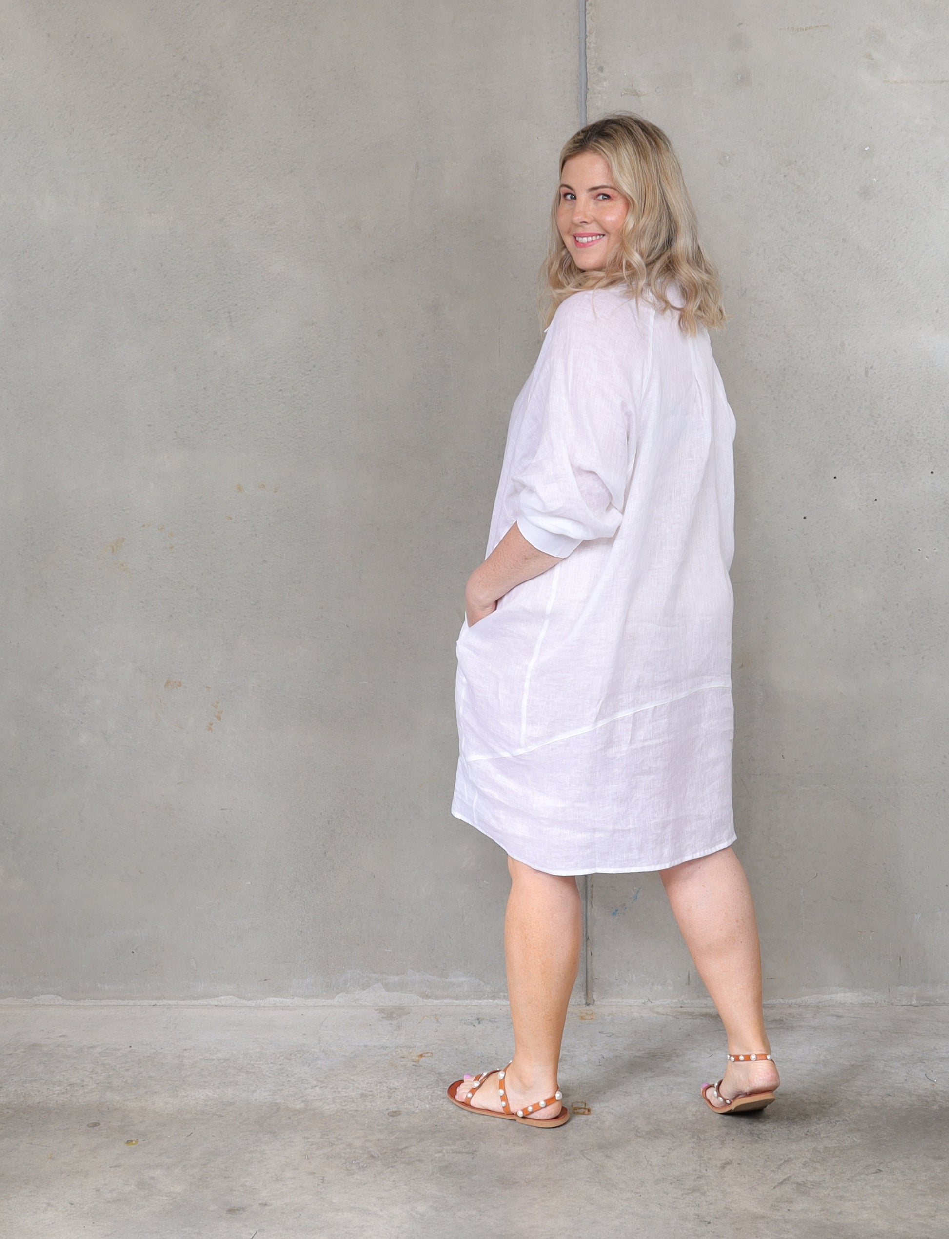 This classic linen shirt dress will take you from brunch with the girl to the beach effortlessly. It can be worn undone as a duster over your everyday look or styled with strappy sandals for a night out. The slight batwing shape is very flattering and the big collar adds a bit of understated elegance.