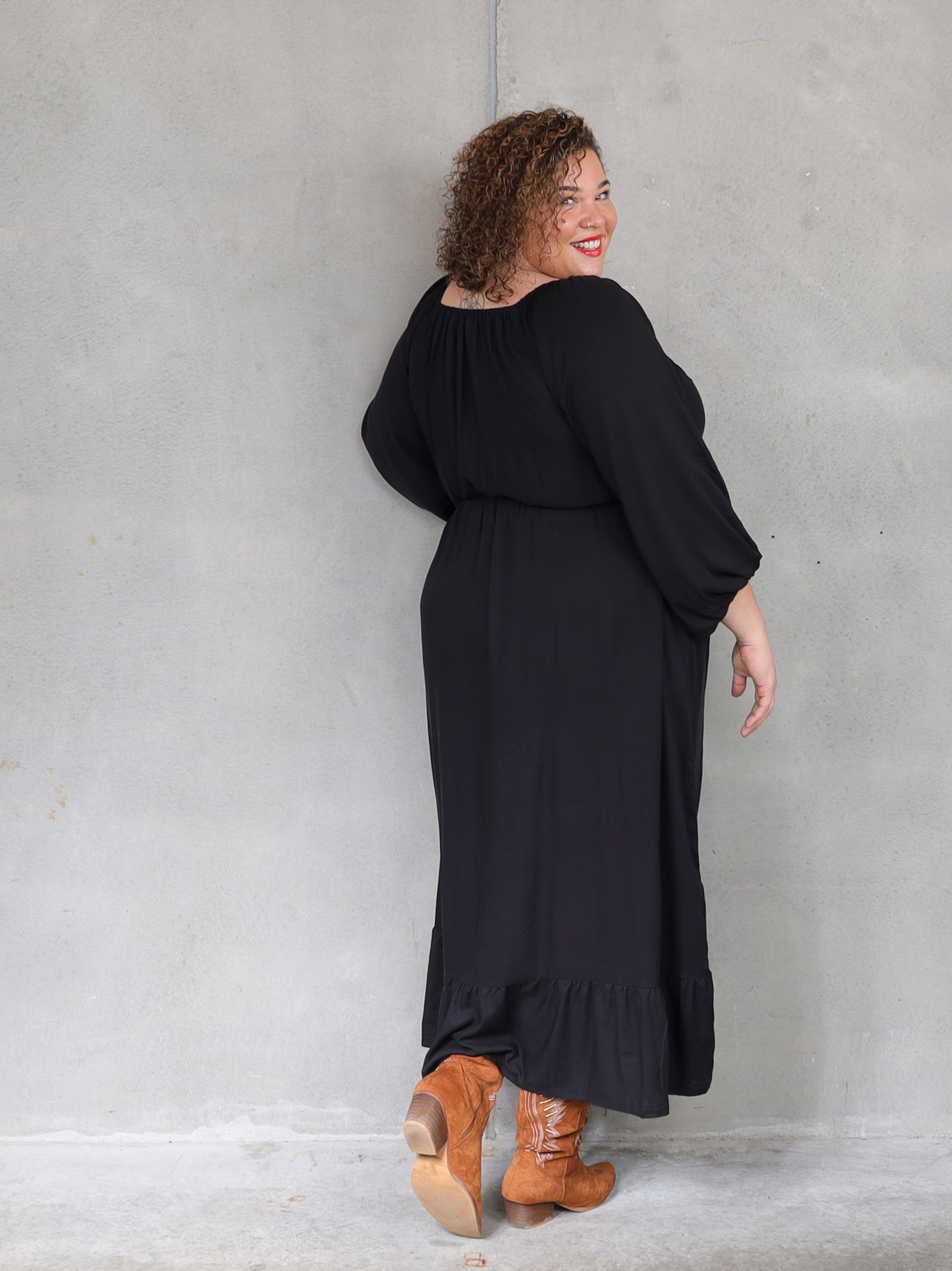 We love our New long sleeve Zoe Dress and we know you will too. The great deep V-neck with wide ties, cute full elasticated sleeves, stretchy waist and long full body is so flattering, it will become a staple in your wardrobe.